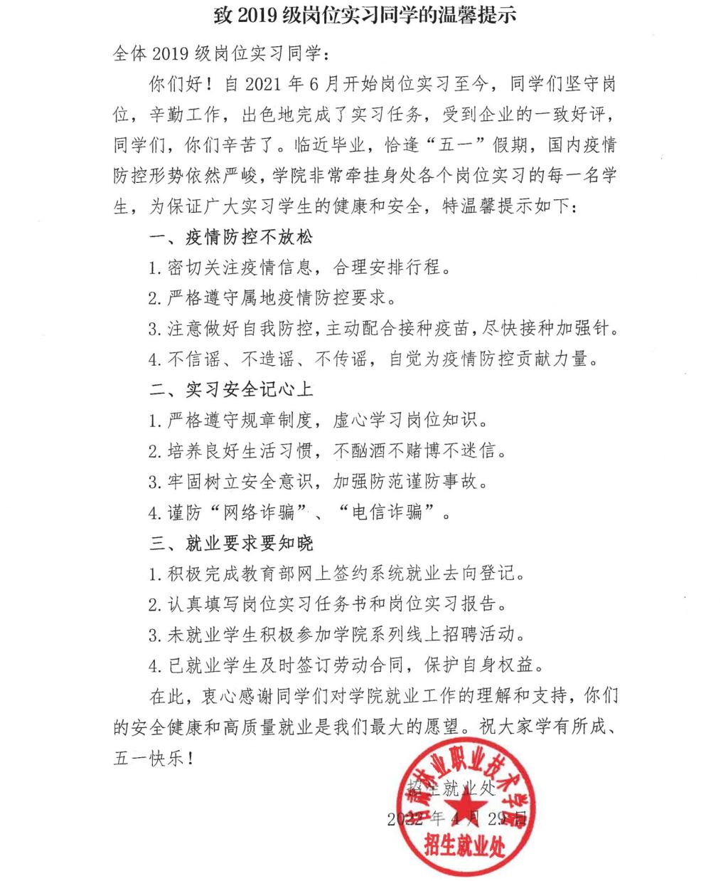 緻2019級崗位實習同學的溫馨提示